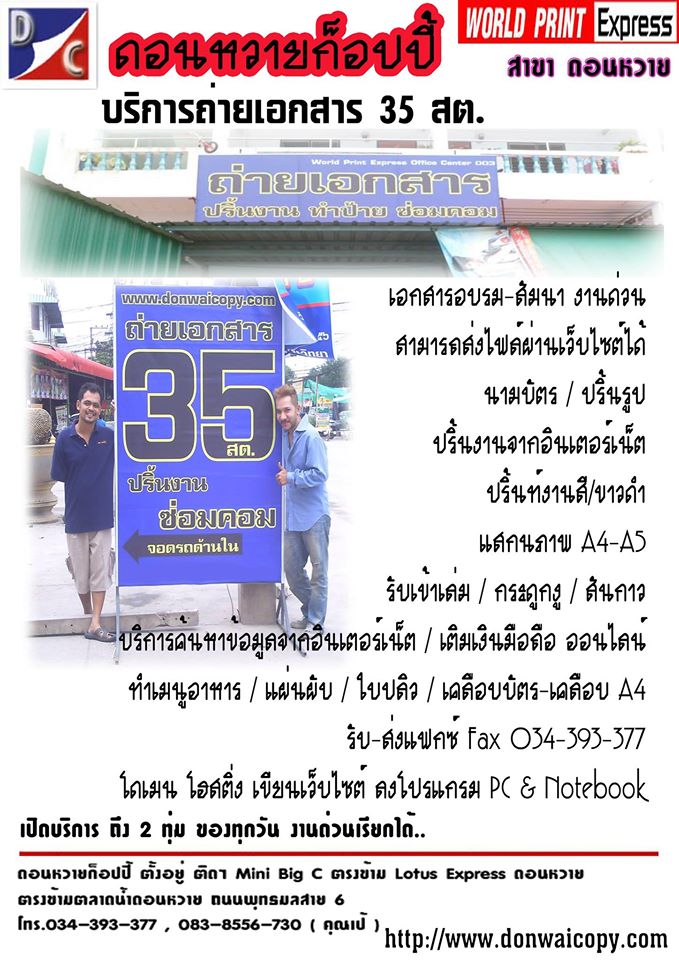 สามารถเยี่ยมชม เราได้ ไม่ว่าจะเป็น เว็บไซต์ , เฟสบุ๊ค , บล็อค , Google , GoogleMap เพราะทางเรา ไม่เคยหยุดพัฒนา http://www.facebook.com/donwaicopy http://donwaicopy.blogspot.com/ สามารถติดต่อเราได้ที่ บ้านเลขที่ 89/2 หมู่ 5 ต.บางกระทึก อ.สามพราน จ.นครปฐม 73210 โทร : 0-3439-3377 , 0-85836-3536 FAX : 0-3439-3377 INBOX : http://m.me/donwaicopy ID-Line : donwaicopy , a-donwaicopy |
