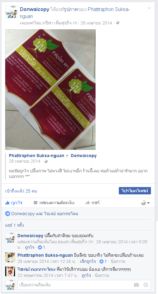 นี่คือคำชมจากลูกค้า ผ่านทางแฟนเพจ