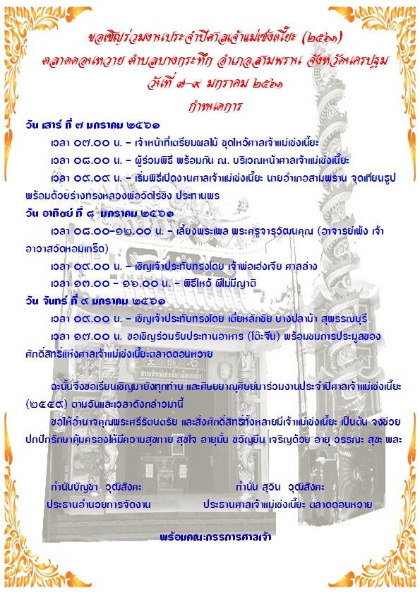 ขอเชิญร่วมงานประจำปีศาลเจ้าแม่เซ่งเนี๊ยะ (๒๕๖๑ )